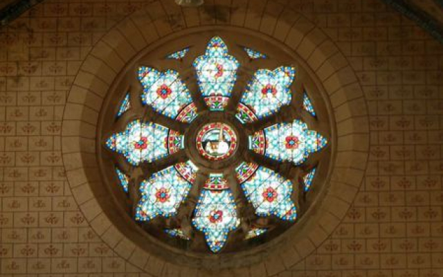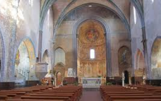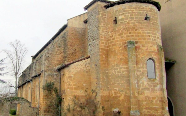 Si de la nef nous regardons vers le chevet, nous voyons se dresser une haute arcature romane qui domine un autel en marbre du 19ème et si nous regardons à l’opposé, vers la face ouest, on y voit une rosace à verres peints à archivolte, du 19ème siècle. En saillie sur un contre-fort nord, une chaire circulaire en pierre, à base conique, se détache. On y accède par un escalier en pierre ménagé dans le mur de refend.