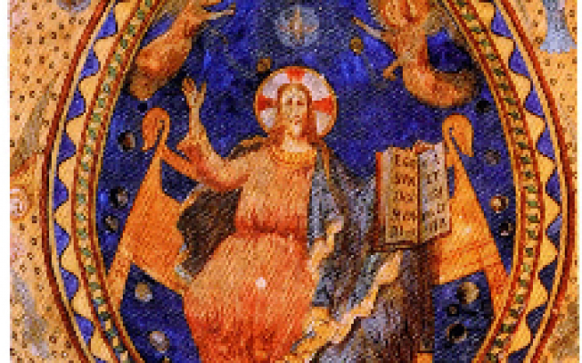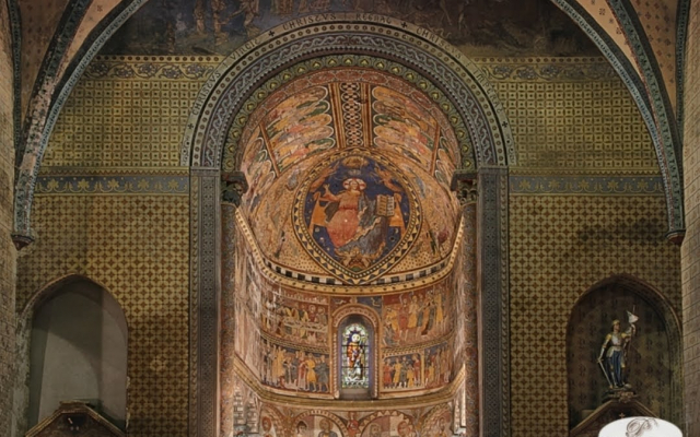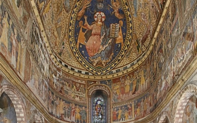 -au quatrième étage, vingt-quatre vieillards tiennent fiole et instrument de musique. Dans le cul-du-four, le Christ en majesté est entouré des symboles des quatre évangélistes et au dessus de lui, la colombe, symbole de l’esprit, et une représentation de Dieu.
