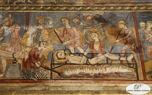 -au deuxième étage, sept tableaux retracent la vie et le martyre de Saint-Laurent, patron de l’église de Panjas ; sur le sixième tableau, il est représenté étendu sur un gril, grillé à petit feu ;